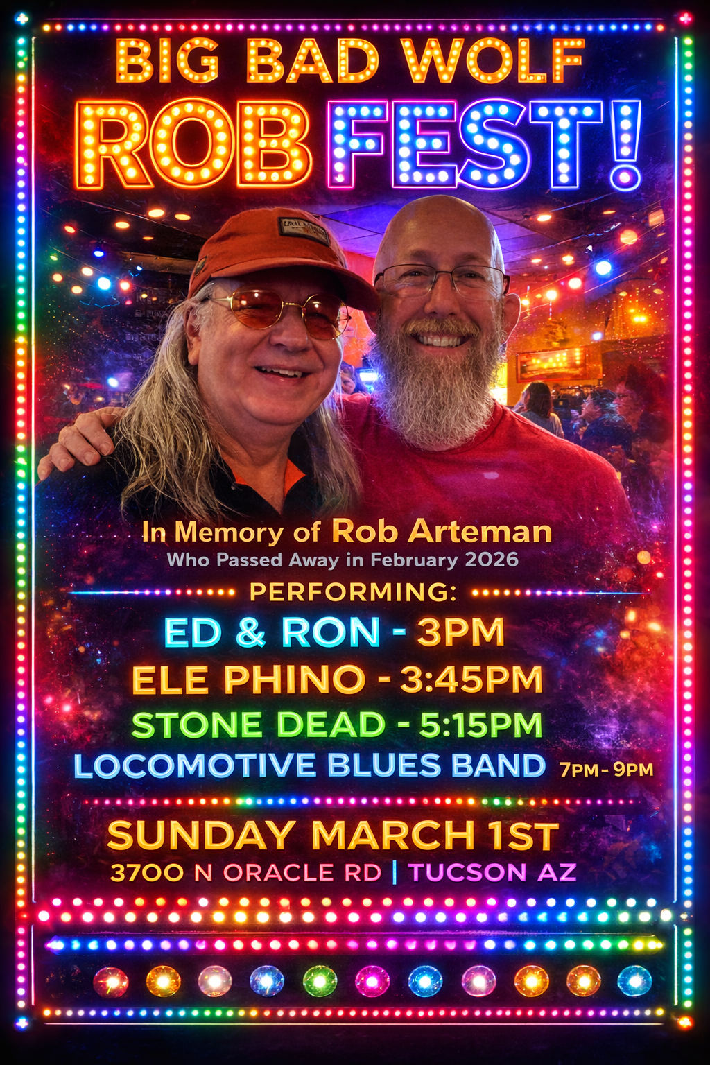 Big Bad Wolf Bar & Grill Tucson 3706 N Oracle Rd, Tucson, AZJoin us for the very first RobFest, a day of live music celebrating the life and legacy of our friend Rob Arteman, who passed away in February 2026. Let’s honor Rob with great music, good friends, and a full day of remembrance and community. Lineup:• Ed & Ron – 3PM• Ele Phino – 3:45PM• Stone […]