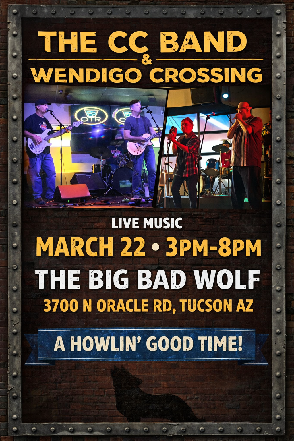 Big Bad Wolf Bar & Grill Tucson 3706 N Oracle Rd, Tucson, AZThe CC Band & Wendigo Crossing at The Big Bad Wolf 🎶🐺 It’s a live music double header you won’t want to miss! Join us at The Big Bad Wolf for a special event featuring The CC Band and Wendigo Crossing, bringing two great sounds together for one unforgettable day of music. Expect great musicianship, […]